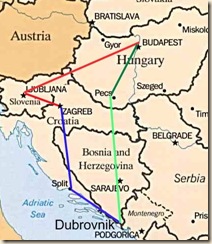 Un mot court aujourd'hui puisqu'il s' agit de úti qui veut dire itinéraire, trajet. út voulant dire la route, útca la rue etc... ce n' est pas un mot très dur à retenir. Et voici, ci-dessous une petite carte avec notre trajet prévu, les couleurs représentent les jours. Nous ne dormirons pas à Sarajevo ! (D' ailleurs nous ne savons pas si nous aurions bien dormi dans cette ville ...). Nous comptons être à LJ (Ljubljana) pour le midi, donc nous partirons à la fraîche, avec des provisions en nourriture et eau ...